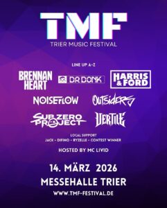 Am 14. März 2026 bringt das Trier Music Festival (TMF) wieder harte Kicks, treibende Drops und massiven Bass in die Moselstadt. Während andere Events noch im Winterschlaf sind, startet hier die Indoor-Season für Hardstyle-Fans.